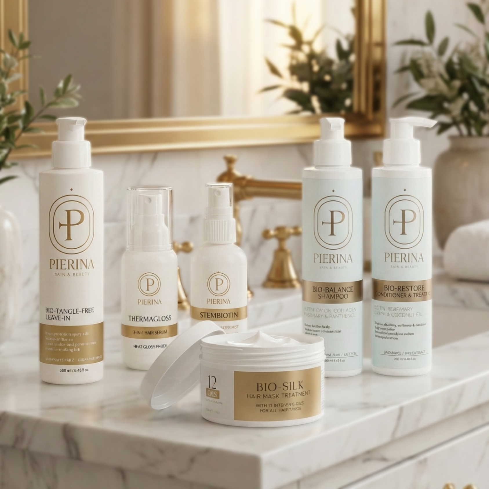 This system includes a nourishing shampoo and conditioner that strengthen and balance the hair, an intensive hair mask enriched with natural oils that deeply repairs, Stembiotin to stimulate the scalp and support stronger, healthier-looking hair, a detangling leave-in with heat protection that hydrates and controls frizz, and Thermagloss, which seals the hair, enhances shine, and protects against heat styling.